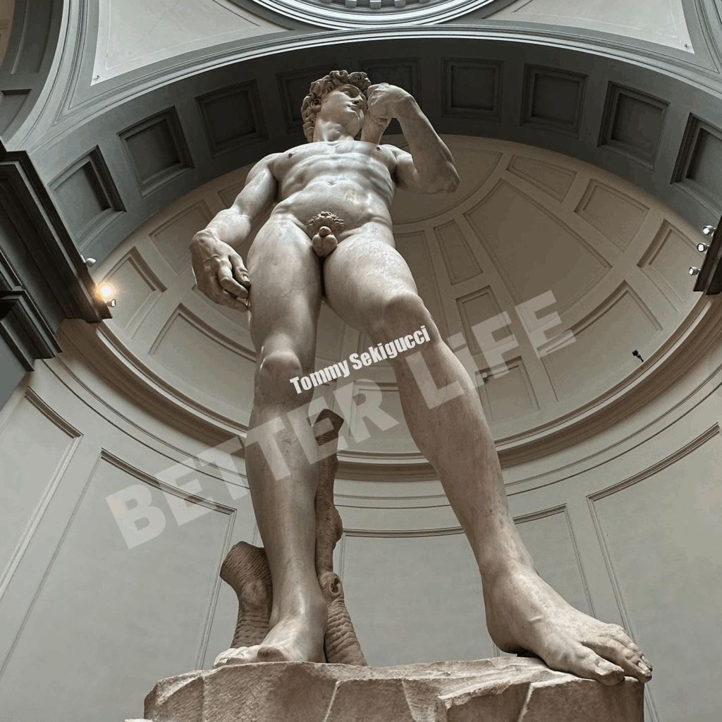 旅行2023.10.122025.11.29人と違った物の見方、考え方をしたい 股座下からのアングルはそんな気持ちの現れです わしのまたのたまのしわ・・は、ないようです。神は細部に宿る。 ミケランジェロ、もーちょい頑張れよ😅 念願のダビデ像を見てきました。