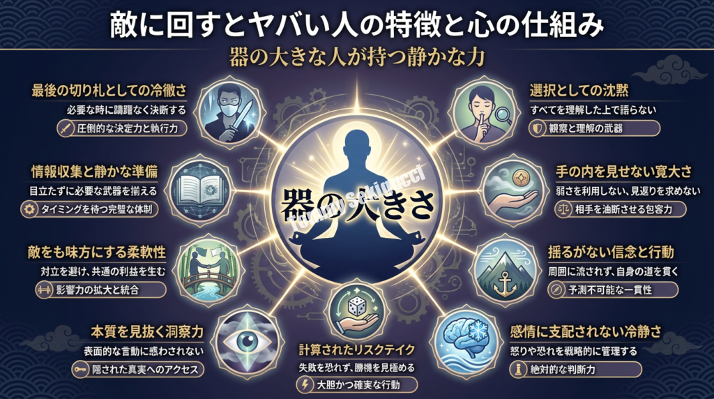 人間関係において、「この人だけは敵に回してはいけない」と直感的に感じる相手がいます。彼らは表面的には穏やかで礼儀正しく、争いを避けているように見えます。しかし、その奥底には計り知れない深さがあり、もし敵対したなら、気づいたときには既に勝負がついている――そんな恐ろしさを秘めた人々です。