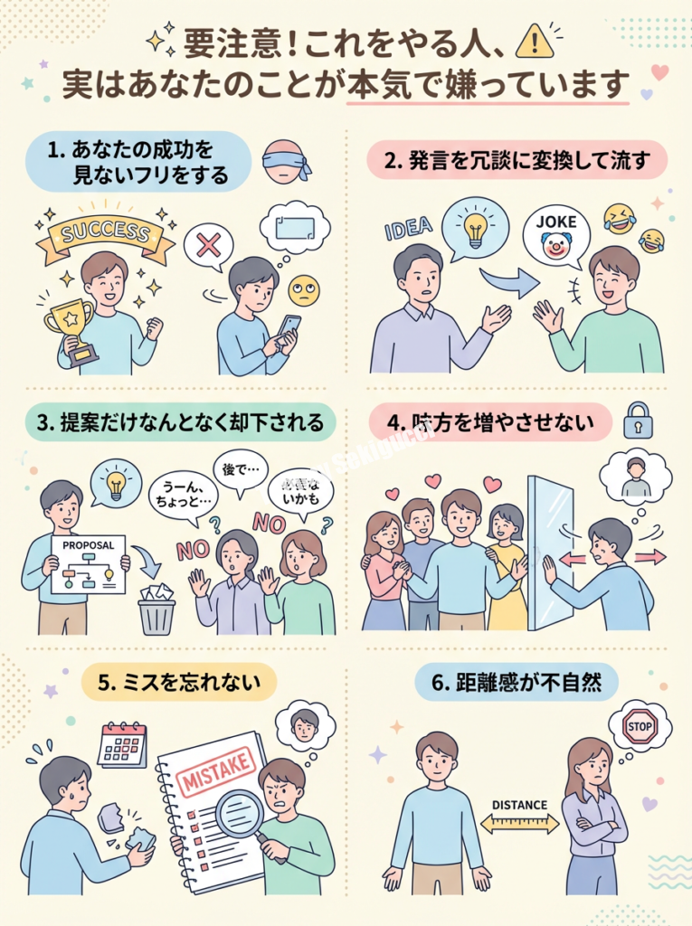 あなたの成功を見ないフリをする、あなたの発言を冗談に変換して流す、あなたの提案だけなんとなく却下する、あなたの味方を増やさせない、あなたのミスを忘れない、あなただけに距離感が不自然になる。これらのサインは、相手があなたに対して抱いている強い否定的感情の表れです。