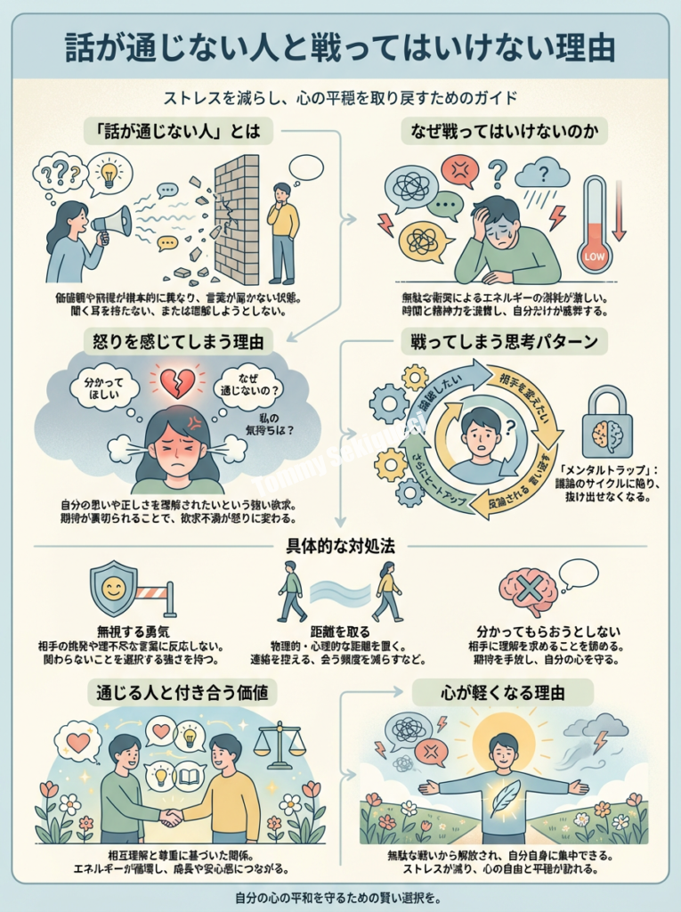 今回の記事では、「話が通じない人」とは一体どういう存在なのか、なぜ彼らと戦ってはいけないのか、そして自分の心と人生を守るためにはどうすればよいのかを、心理学的・経験的・戦略的な観点から深く掘り下げていきます。これは単なる対人関係のテクニックではなく、あなたの人生を守るための本質的な知恵です。
