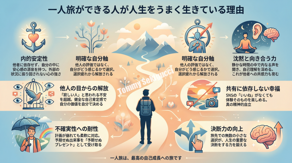 この内的安定性は、旅行だけでなく、人生全般において非常に重要なスキルです。仕事で困難に直面したとき、人間関係でトラブルが起きたとき、予期せぬ変化が訪れたとき――こうした状況で冷静に対処できるかどうかは、内的安定性の高さにかかっています。一人旅ができる人は、旅を通じてこの能力を鍛えているのです。