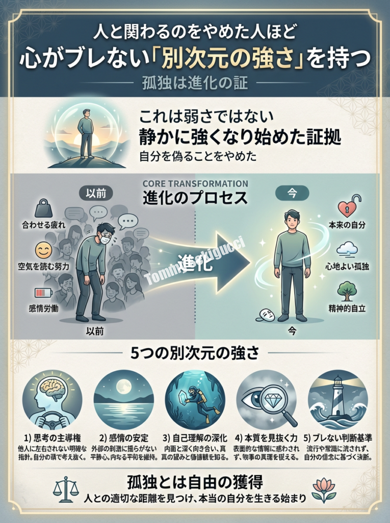 この記事では、人と関わることを意識的に減らした人々が手に入れる「別次元の強さ」について、心理学的な視点から深く掘り下げていきます。なぜ孤独を選ぶことが強さにつながるのか、どのようにして精神的な自立が育まれるのか、そしてその先にどんな新しい人生が待っているのか――それらすべてをお伝えしていきます。