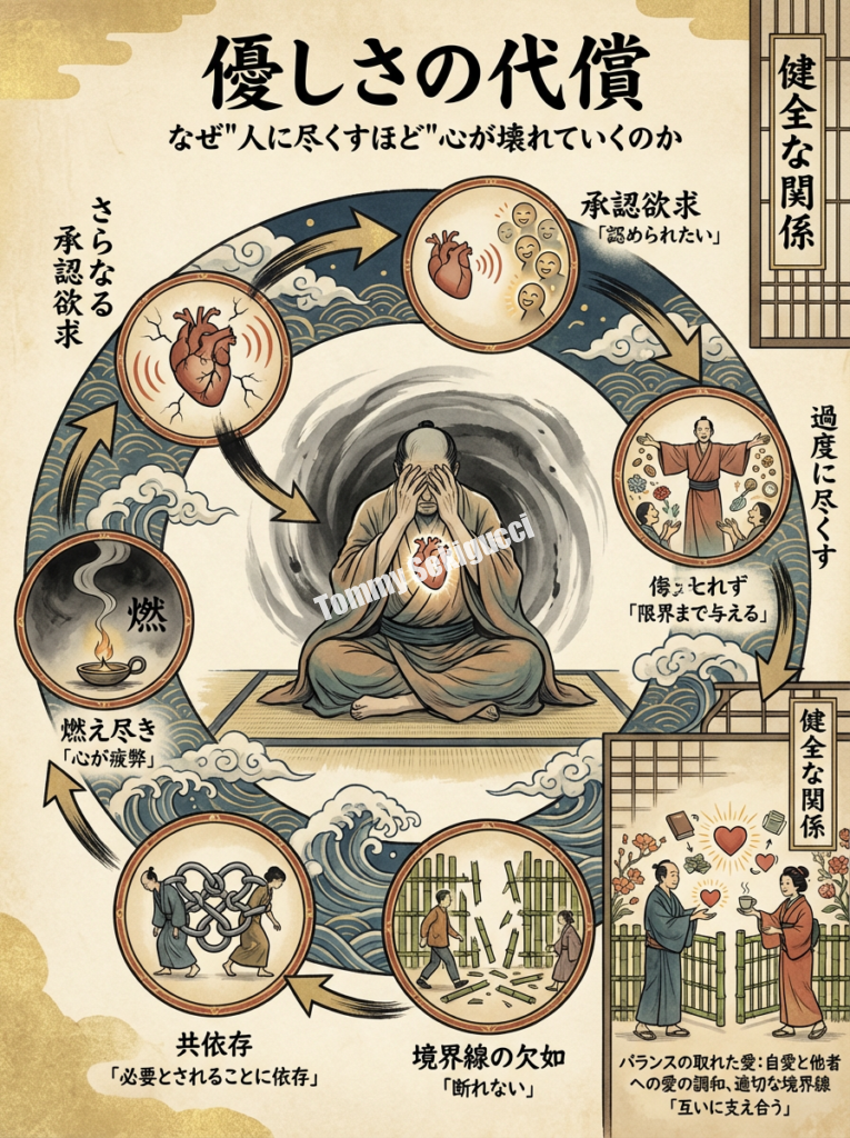 優しさは美徳です。他人を思いやり、困っている人を助け、誰かのために自分の時間やエネルギーを使う。こうした行為は、社会の中で高く評価され、称賛されるものです。私たちは幼い頃から、「人に優しくしなさい」「思いやりを持ちなさい」と教えられてきました。そして、多くの人がその教えを真摯に受け止め、日々誰かのために尽くしています。