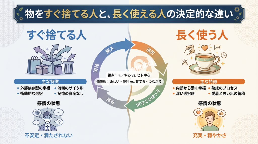今回の記事では、物を長く使う人と、すぐに捨ててしまう人の決定的な違いを、心理学的・哲学的な視点から深く掘り下げていきます。そして、物との付き合い方を見直すことで、いかに人生の質を高めることができるのかを探っていきます。