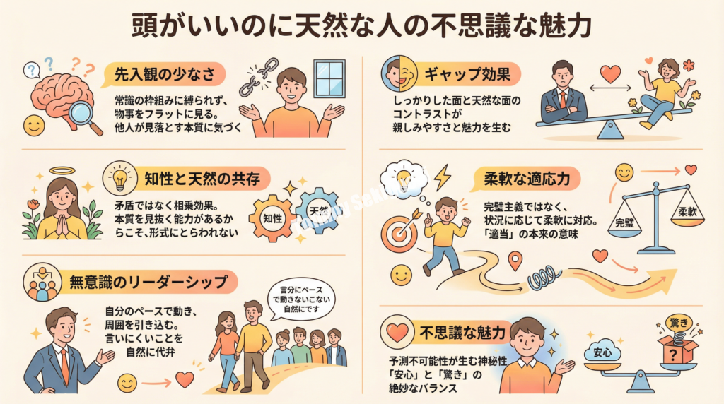 このような「頭がいいのに天然」な人は、なぜか周囲から愛されます。彼らの言動は時に予測不可能で、驚かされることも多いのですが、不思議と憎めない。むしろ、そのギャップこそが人を惹きつける要素になっているのです。
