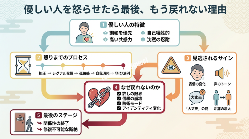 優しい人が怒るという出来事は、単なる感情の爆発ではありません。それは長い時間をかけて準備された、計算された、そして最終的な決断なのです。