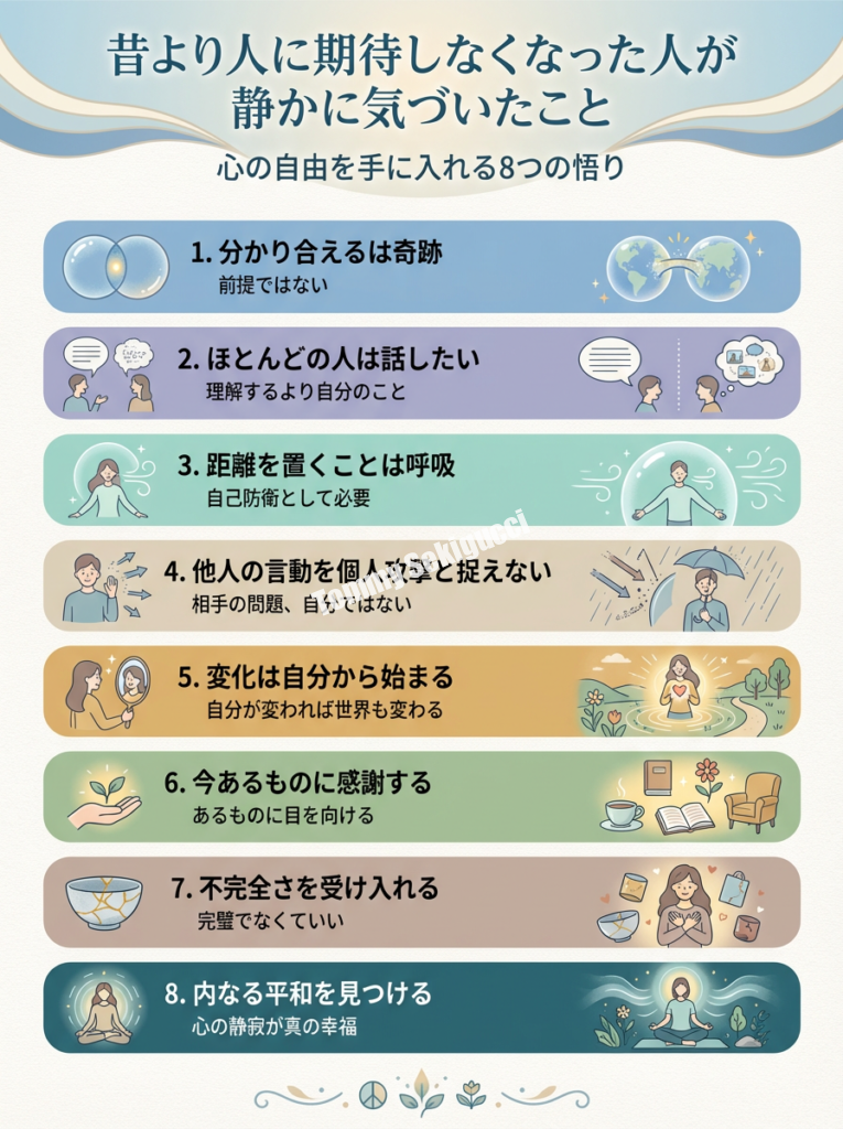 「人に期待しなくなる」というと、ネガティブに聞こえるかもしれません。しかし、実際には、これは精神的な成熟と自立の始まりなのです。他人に依存せず、自分の心の平穏を他人の反応に委ねない。この境地に達したとき、人は初めて真の自由を手に入れるのです。