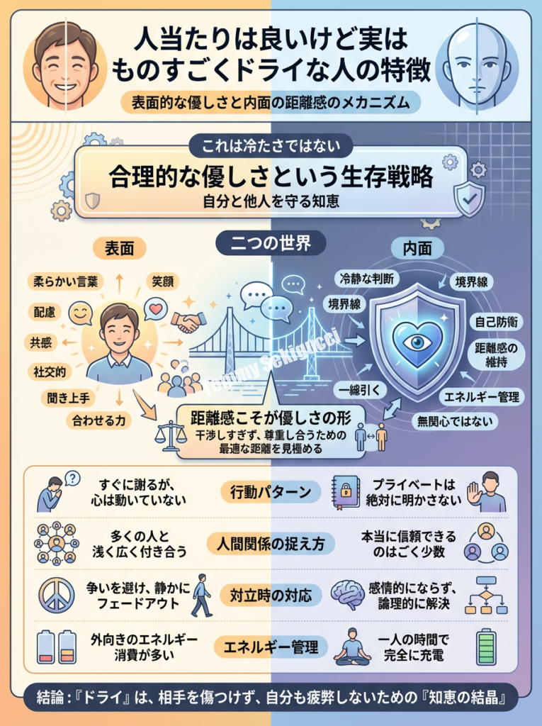 このタイプの人々は、一見すると「人当たりが良い」「優しい」と評価されます。しかし実際のところ、彼らの内面は驚くほどドライで、冷静で、合理的なのです。そしてその「ドライさ」は、決して冷酷さや無関心を意味するものではありません。それは、この複雑な社会を平穏に生き抜くために見つけた、一つの高度な生存戦略なのです。