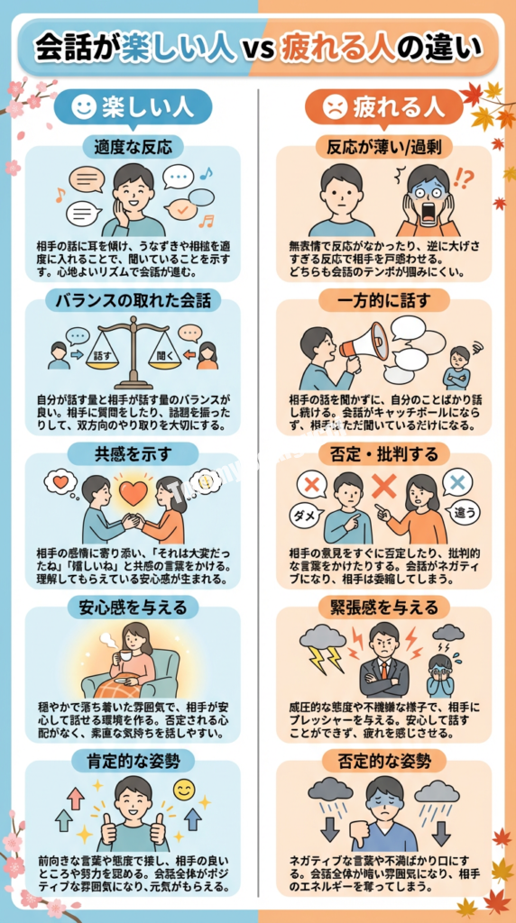 実は、会話が「楽しい人」と「疲れる人」の間には、明確な違いがあります。そして、その違いは、話の内容そのものよりも、話し方やコミュニケーションのスタイルに起因することが多いのです。つまり、「何を話すか」ではなく、「どう話すか」が、相手に与える印象を大きく左右しているのです。