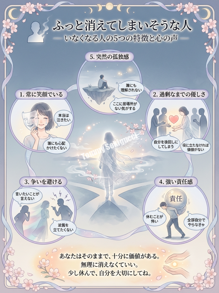 今回は、「急にふっと消えてしまいそうな人」の心理的特徴と、その背景にある深い感情について、心理学や人間関係論の視点から詳しく探っていきます。もしあなたの周りにそのような人がいるのなら、あるいはあなた自身がそう感じているのなら、この記事が理解と気づきのきっかけになれば幸いです。