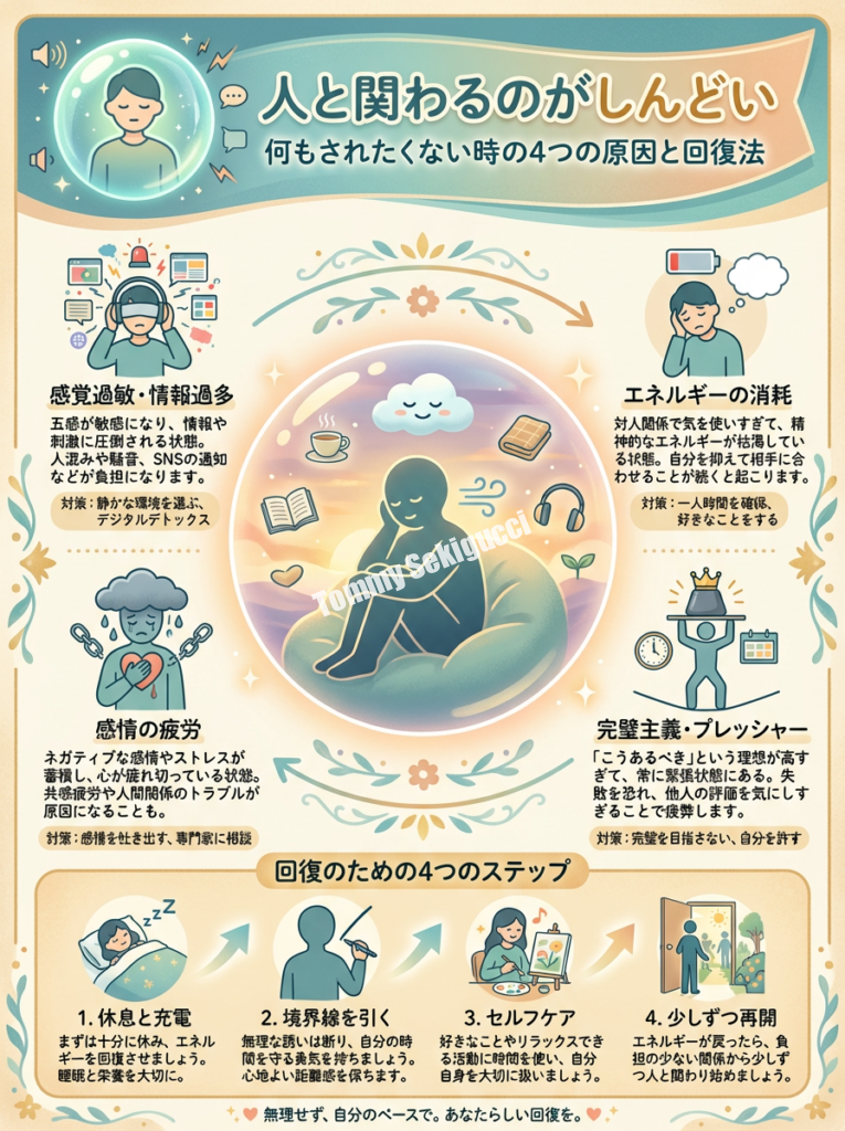 「もう誰とも会いたくない」「一人でそっとしておいてほしい」「誰かと話すことすら億劫だ」――こんな気持ちになったことはありませんか?朝起きて、スマートフォンに届いた通知を見るだけで憂鬱になり、誰かから連絡が来るたびに心が重くなる。そんな日々が続いているとしたら、あなたの心は今、深い疲労のサインを発しているのかもしれません。