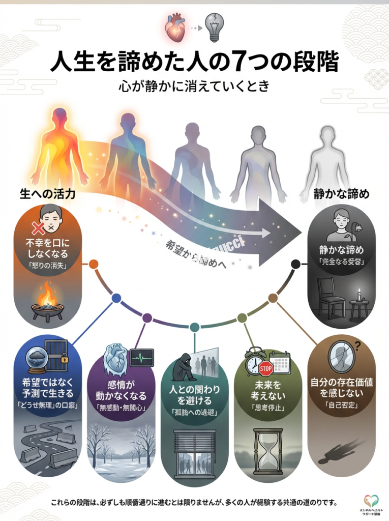 私たちは「諦め」という言葉を軽く使いがちです。試験を諦める、恋愛を諦める、夢を諦める。しかし、人生そのものを諦めるということは、それらとは次元が異なります。それは単に何かを手放すことではなく、自分自身の中にあった「生きる力」そのものが静かに消えていくプロセスなのです。