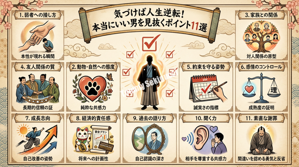 今回の記事では、心理学的な視点と実際の人間関係の観察から得られた知見をもとに、「本当にいい男」を見抜くための11のポイントについて、深く掘り下げていきます。表面的な優しさや一時的な魅力ではなく、その人の本質、価値観、そして人間性を見極めるための具体的な指標をお伝えしていきましょう。